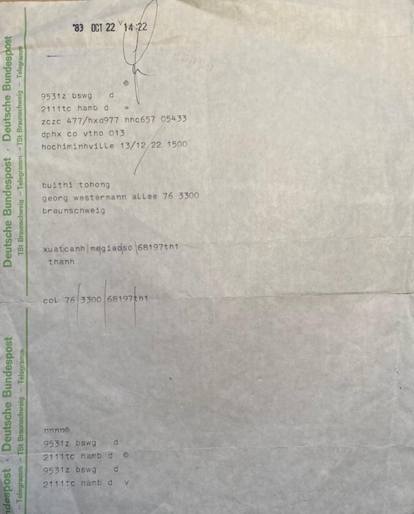 Thời gian đầu ở Bad Nenndorf, mẹ vẫn còn liên lạc thư từ với bác Toàn. Đó là lý do tuy số con gái người Việt chỉ đếm trên „một“ bàn tay mà con trai thì „đông lắm“ – mẹ không nhớ là bao nhiêu – mẹ vẫn „bình chân như vại“, dê chưa kịp đến gần đã bị chó sủa chạy mất dép. Nhưng „loin des yeux, loin du coeur“ – người Đức cũng có câu này „aus dem Auge, aus dem Sinn“ , tiếng Việt là „xa mặt, cách lòng“ – cuối cùng, mẹ bị một người – lại cũng bạn với bác Hiệp – cưa đổ. Mẹ có kể cho bác Toàn nghe, bác ấy nói mẹ được quyền quyết định, chuyện mà bác ấy lo sợ đã xảy ra, nhưng không ngờ sớm hơn dự tính. Thư từ thưa dần và đến khoảng đầu năm 1982 thì chấm dứt.