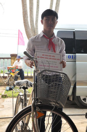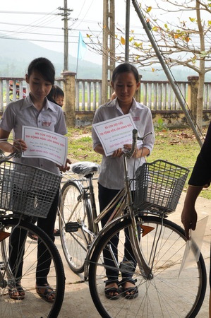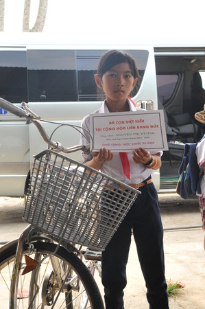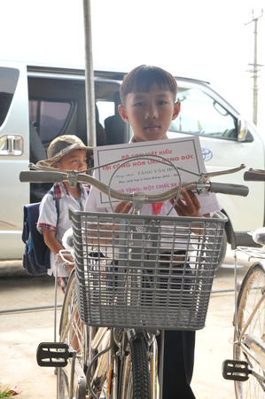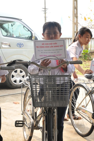 Giây phút đợi chờ của các cháu đã đến. Trước hết cô Huyền gọi tên của 25 cháu để nhận thực phẩm và sau đó là tên 7 cháu nhận xe đạp. Nhìn ánh mắt sung sướng và rạng ngời của các cháu lên nhận xe đạp, ai trong chúng tôi cũng cảm xúc, vui lây. Có vài cháu đã đạp thử vài vòng trong sân trường, nhưng cũng có các cháu khác thì rờ rẫm, vuốt ve, ngắm nhìn chiếc xe đạp như một vật quí báu đầu tiên trong đời …